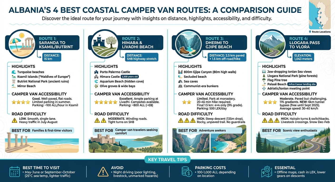 Albania offers four standout coastal routes, each with unique landscapes, driving challenges, and must-visit stops. From the turquoise waters of Ksamil to the dramatic heights of Llogara Pass, there's something for every traveler. Whether you're driving a camper van or renting a car, this guide helps you decide which route suits your style.